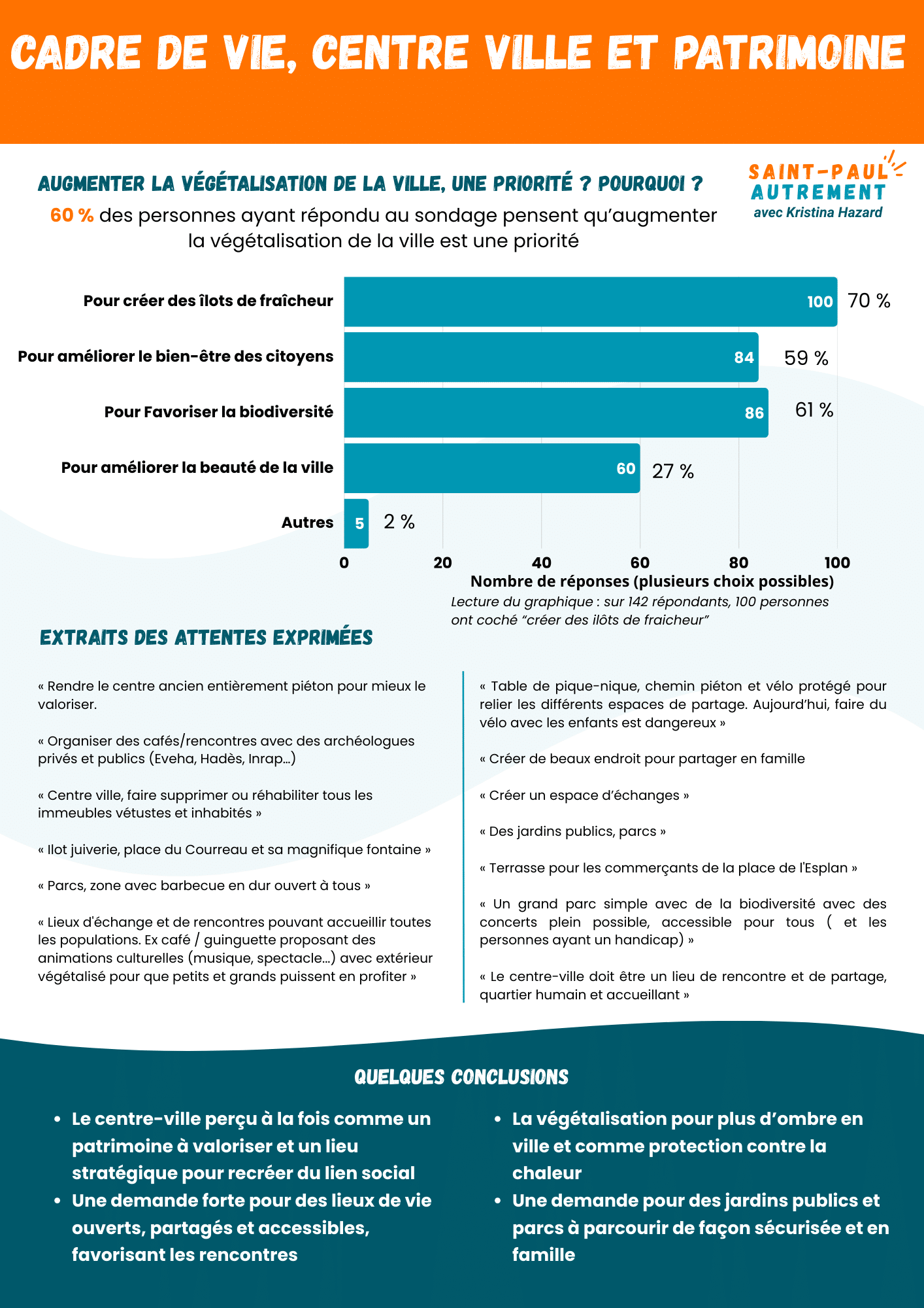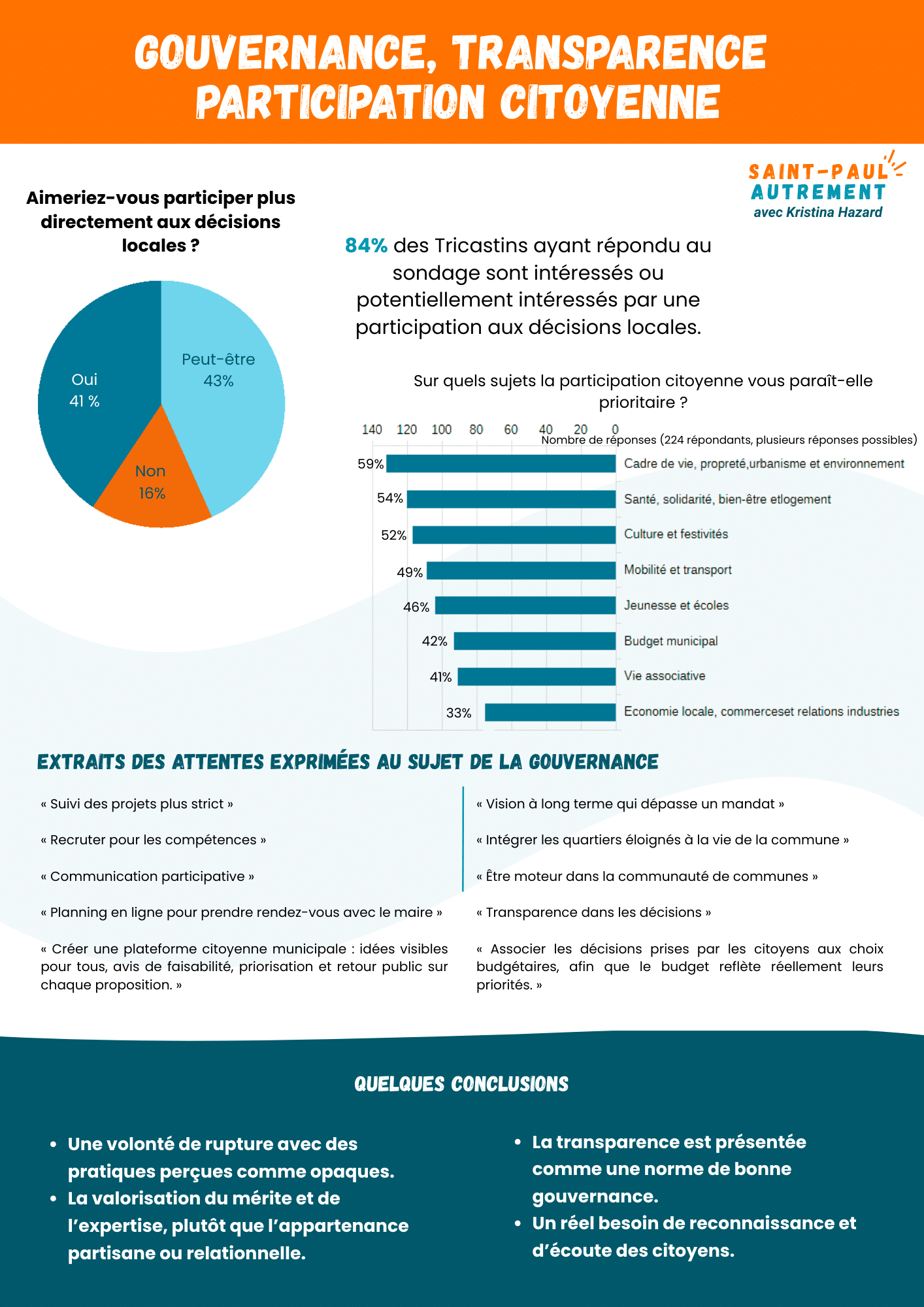 Nous tenons à préciser que notre sondage repose sur un échantillon aléatoire et ne permet pas d’extrapoler des résultats précis. Mais il a le mérite de mettre en lumière les grandes préoccupations de notre commune.