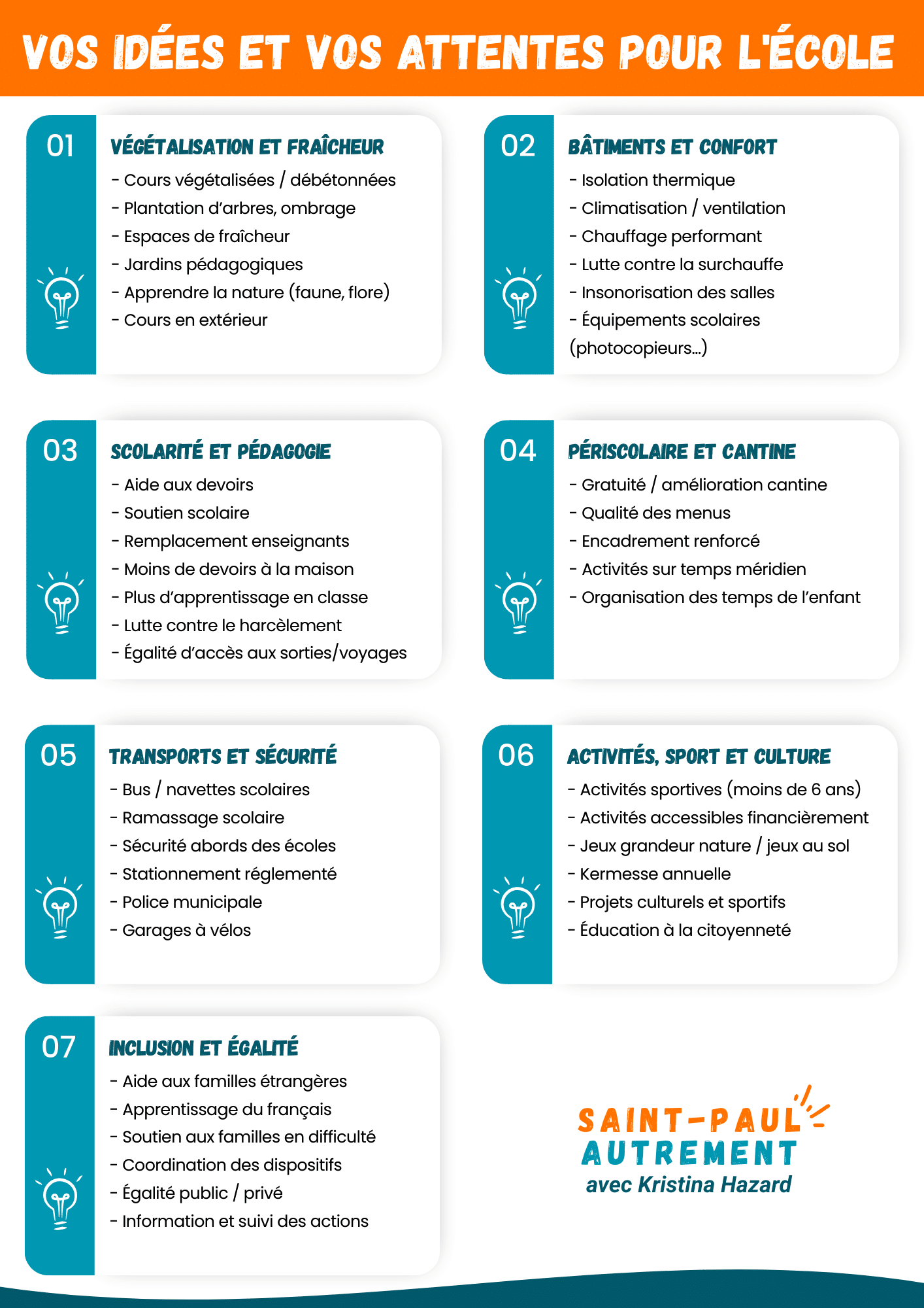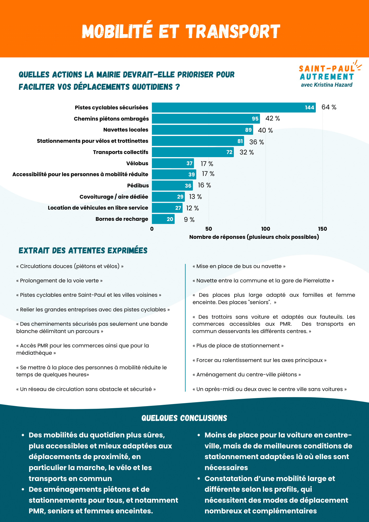 Pour agir, il faut d’abord comprendre. Pour cela nous avons aussi réalisé un sondage d’opinion. Il nous a permis de mieux connaître les difficultés, les attentes et les ambitions de nos concitoyens. Un questionnaire construit autour de huit grands thèmes qui touchent directement la vie quotidienne :