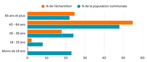 Par conséquent, les résultats issus de cet échantillon doivent être interprétés avec prudence. Ils sont principalement représentatifs des points de vue d’une population adulte et senior, et ne peuvent être généralisés à l’ensemble de la population communale sans ajustement méthodologique.